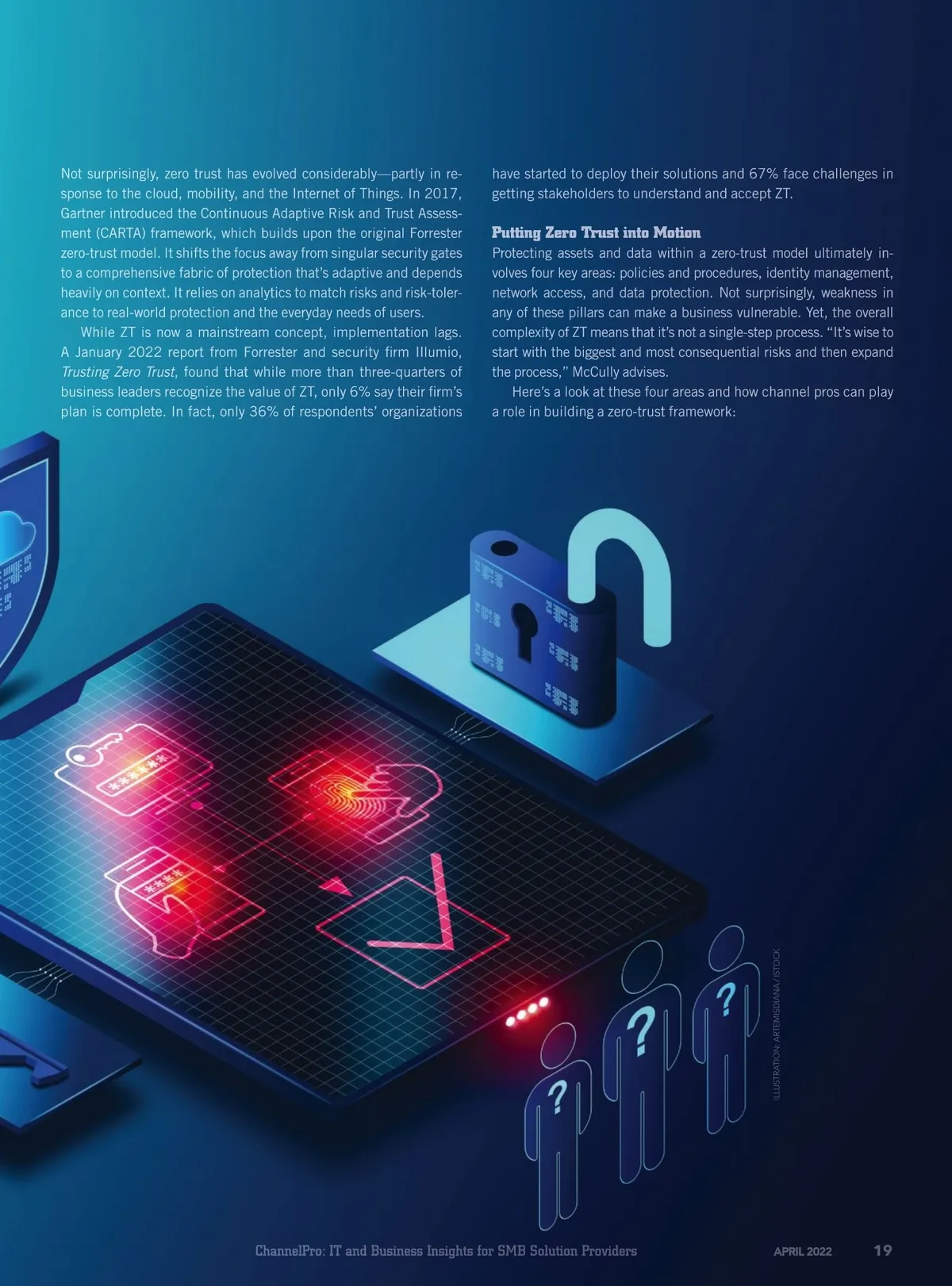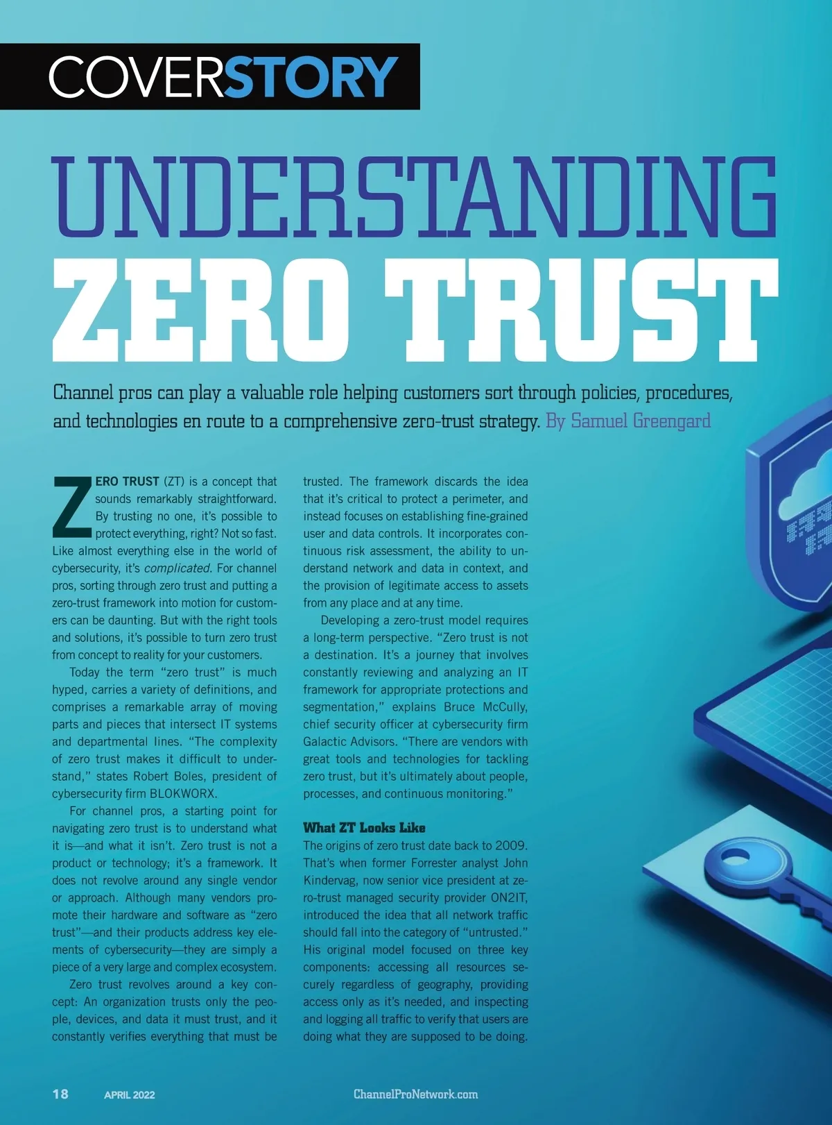COVER STORY UNDERSTANDING ZERO TRUST Channel pros can play a valuable role helping customers sort through policies, procedures, and technologies en route to a comprehensive zero-trust strategy. By Samuel Greengard trusted. The framework discards the idea that it’s critical to protect a perimeter, and instead focuses on establishing fine-grained user and data controls. It incorporates con-tinuous risk assessment, the ability to un-derstand network and data in context, and the provision of legitimate access to assets from any place and at any time. Developing a zero-trust model requires a long-term perspective. “Zero trust is not a destination. It’s a journey that involves constantly reviewing and analyzing an IT framework for appropriate protections and segmentation,” explains Bruce McCully, chief security officer at cybersecurity firm Galactic Advisors. “There are vendors with great tools and technologies for tackling zero trust, but it’s ultimately about people, processes, and continuous monitoring.” Z ERO TRUST (ZT) is a concept that sounds remarkably straightforward. By trusting no one, it’s possible to protect everything, right? Not so fast. Like almost everything else in the world of cybersecurity, it’s complicated . For channel pros, sorting through zero trust and putting a zero-trust framework into motion for custom-ers can be daunting. But with the right tools and solutions, it’s possible to turn zero trust from concept to reality for your customers. Today the term “zero trust” is much hyped, carries a variety of definitions, and comprises a remarkable array of moving parts and pieces that intersect IT systems and departmental lines. “The complexity of zero trust makes it difficult to under-stand,” states Robert Boles, president of cybersecurity firm BLOKWORX. For channel pros, a starting point for navigating zero trust is to understand what it is—and what it isn’t. Zero trust is not a product or technology; it’s a framework. It does not revolve around any single vendor or approach. Although many vendors pro-mote their hardware and software as “zero trust”—and their products address key ele-ments of cybersecurity—they are simply a piece of a very large and complex ecosystem. Zero trust revolves around a key con-cept: An organization trusts only the peo-ple, devices, and data it must trust, and it constantly verifies everything that must be What ZT Looks Like The origins of zero trust date back to 2009. That’s when former Forrester analyst John Kindervag, now senior vice president at ze-ro-trust managed security provider ON2IT, introduced the idea that all network traffic should fall into the category of “untrusted.” His original model focused on three key components: accessing all resources se-curely regardless of geography, providing access only as it’s needed, and inspecting and logging all traffic to verify that users are doing what they are supposed to be doing. 18 APRIL 2022 ChannelProNetwork.com